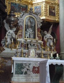The Priest Approaches and Kisses the Altar: The altar is a symbol of Christ. In it are cut five crosses to recall the five wounds of Christ. The altar also represents the Church and has embedded in it the relics of her saints. The priest comes to the altar to celebrate the Sacrifice in the Church's name. Because of the glory surrounding the altar upon which the divine Sacrifice will be made, the kiss of the priest unites the Church to Christ, its Redeemer.